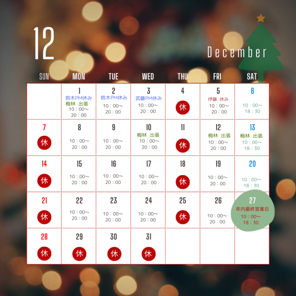 年内の営業は、12月27日(土)10:00~14:00まで。