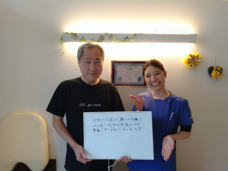 半年以上前に右のお尻、膝の後ろ、ふくらはぎに痛みが出現し、車の乗り降りも大変な状況でした。整形外科に通っていましたが良くならず、ここに来るまでも真っ直ぐ歩く事もできませんでした。今まで経験したことのない痛みが続いてこのまま改善しなかったらどうしようと不安でした。