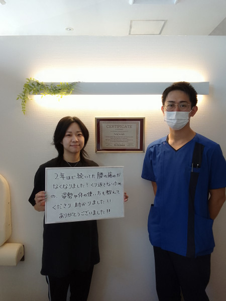 「腰の凝りが良くなり可動域が広がりました!」 身体の凝りがなくなって動きが軽くなりました! 足、腰、肩などの凝りがずっとありました。足のむくみも夕方になってくるとしんどくなってくるため気になっていました。身体の可動域が広がるといいなと思っていました。 ここの施術を受けてみて、去年よりも体が軽く動くようになったと実感しています。また、ほかのところに比べ、一時的なものでないため短時間の施術でも効果が高いと思います。 先生もとても親切で、些細なことを聞いても毎回丁寧に答えていくれました。自宅でできるストレッチも教えてもらい、ありがたかったです! 同じ職場の仲間や友達にも紹介したいです。 ※個人の感想です。効果には個人差があります。 |